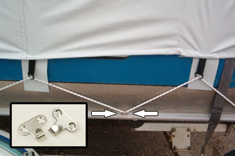 Tie down kit installed to cover for quick fastening and a snug secure down the road fit. Stainless steel hooks can be installed to the boat trailer frame or even the spray of some aluminum boats. Continuous bungee cord is then strung through tie down loops of the cover and then stretched down to each hook creating tension around the perimeter of the boat cover. Kit includes 16 stainless steel hooks and 50' of bungee cording. (attaching screws or rivots are not included)